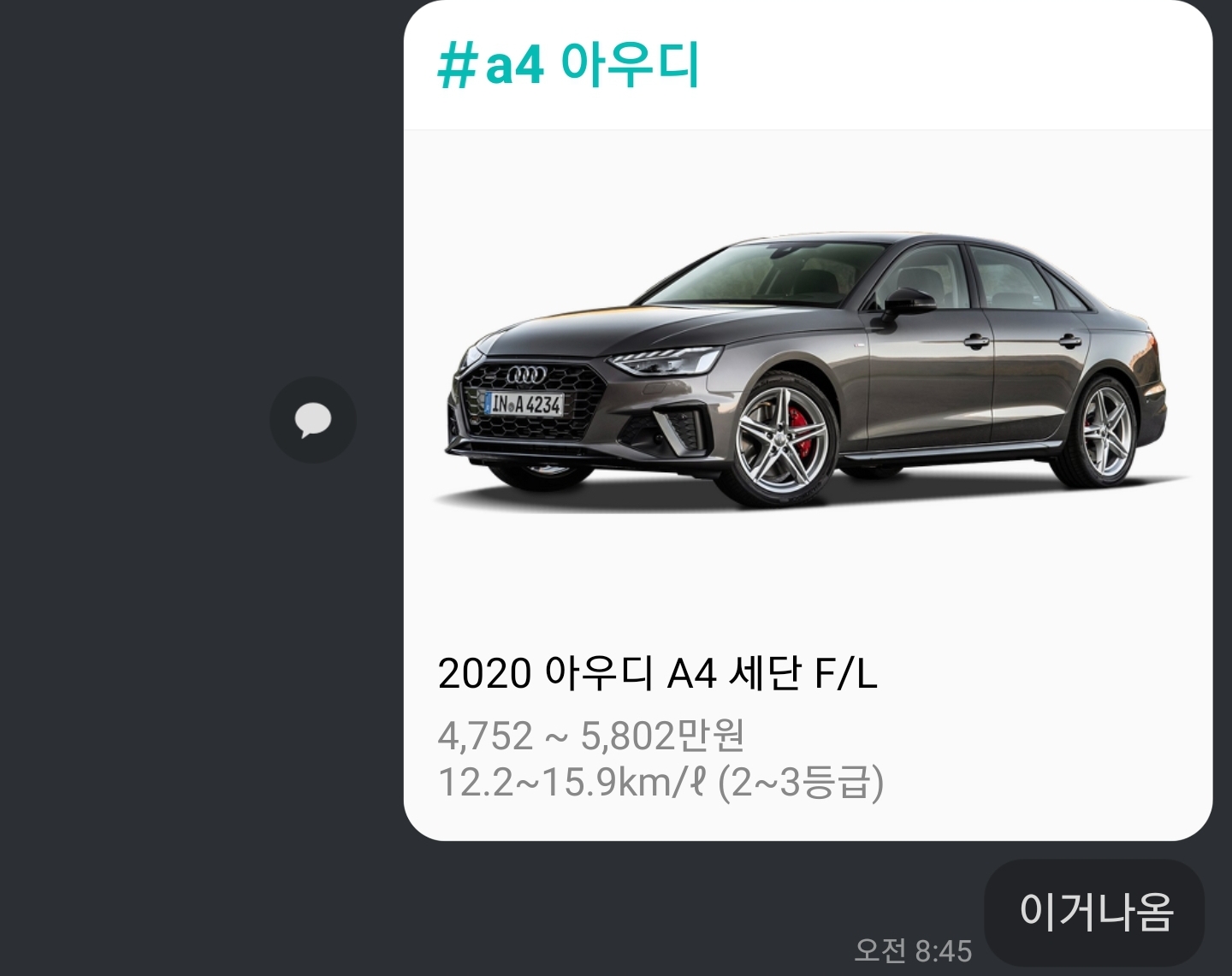 배우자에게 A4 신형이 나왔다고 카톡을 해주었다.