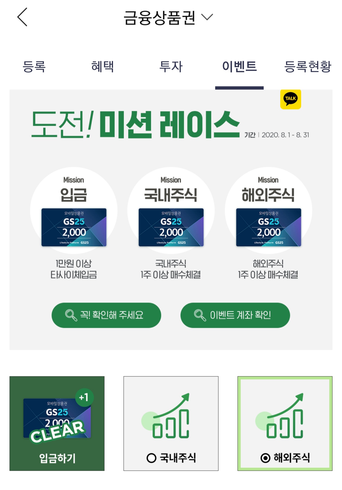 1. 금액 1만 원 이상을 타 은행에서 한국투자증권에 이체하면 GS25 상품권 2천 원 획득