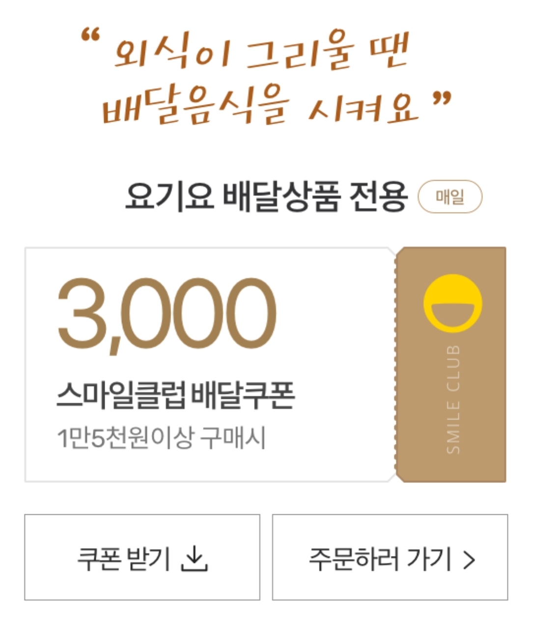스마일클럽에서 배달비 3천원 할인쿠폰과 스마일캐시를 이용하면 저렴하게 음식을 먹을 수 있습니다.