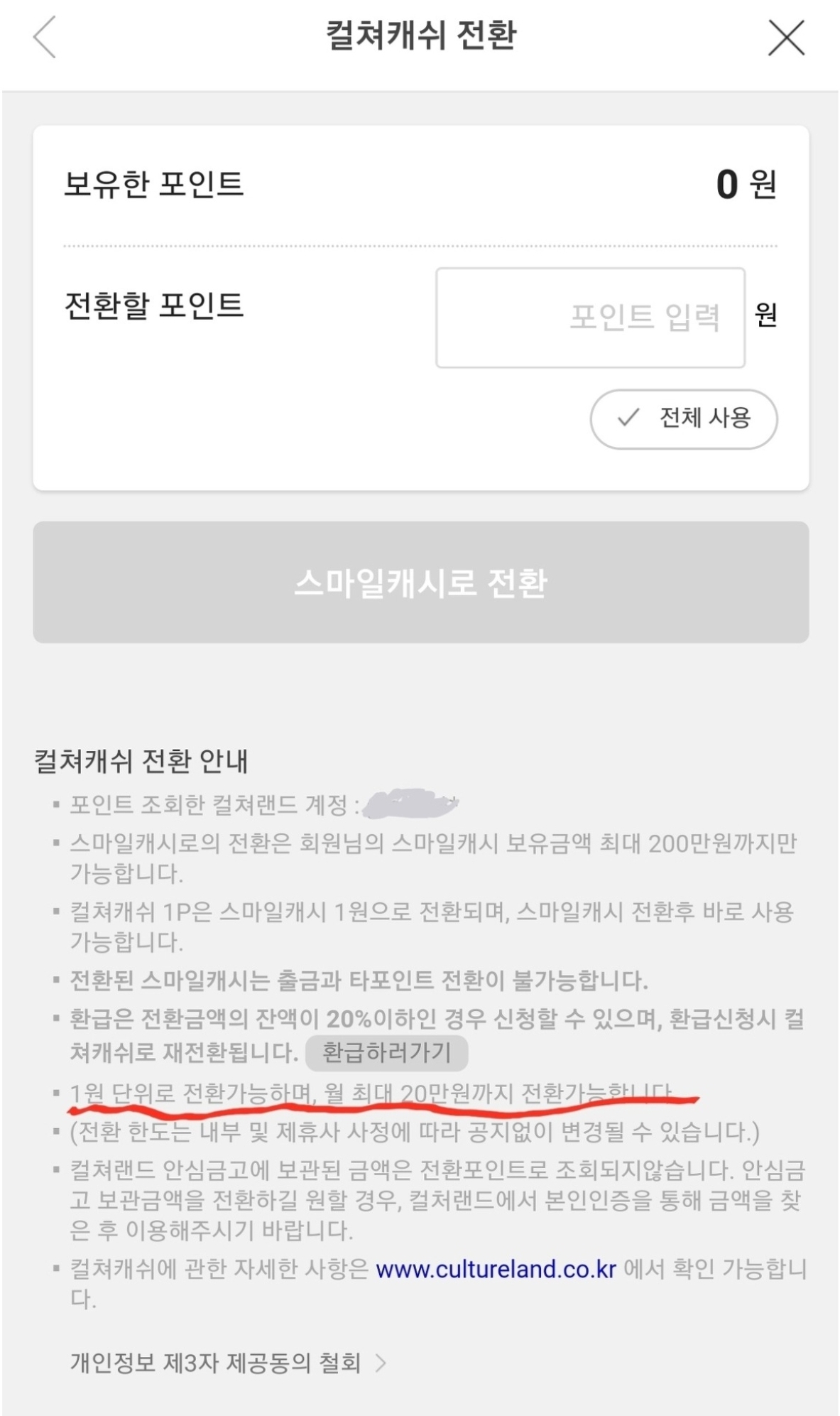 그 이유는 컬처랜드 캐시 -> 스마일 캐시로 변경할 시 한 달 최대 10만 원 밖에 교환이 되지 않습니다.