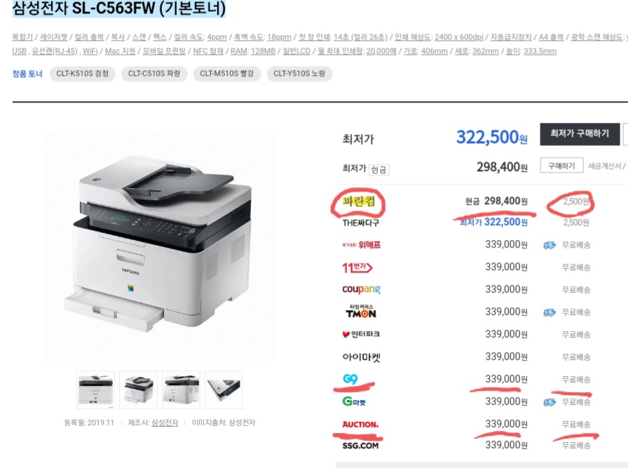 위와 같이 준비하여 G마켓에서 삼성 레이저 칼라 복합기를 구매한다고 해봅시다.