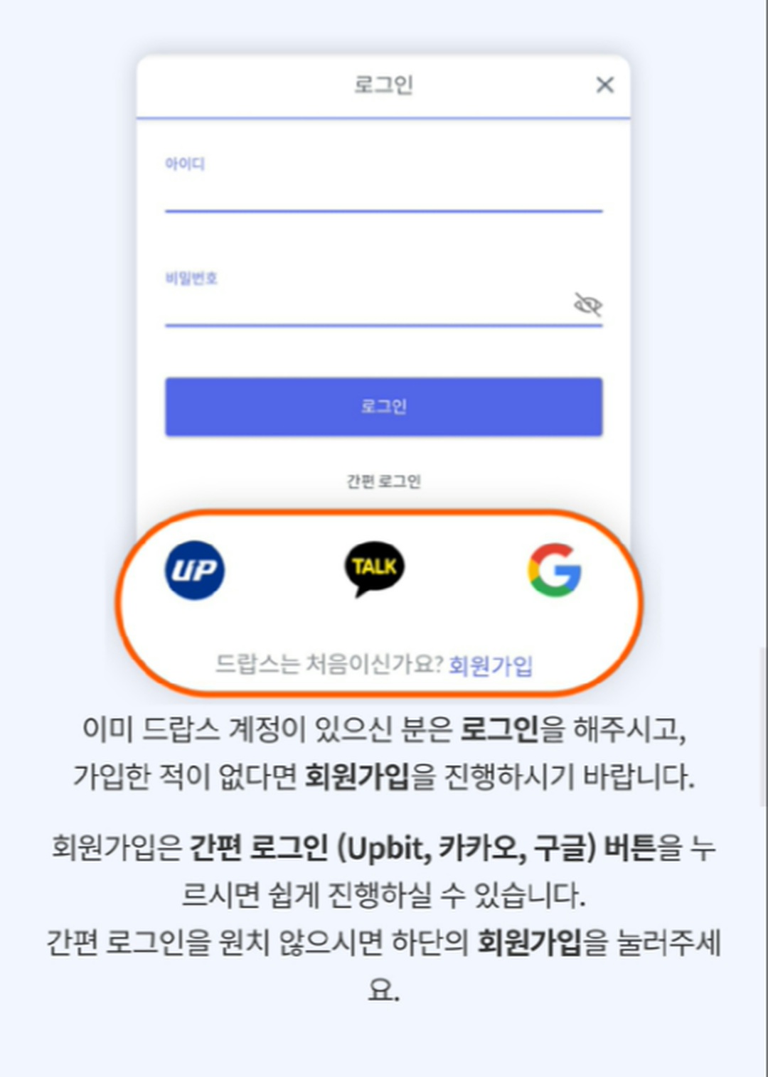 6. 아이디가 없으니 하단 간편 로그인으로 간편 가입