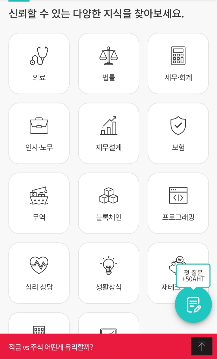 지식을 공유하는 사이트이지만, 출석체크만으로 아하토큰(AHT)을 얻어 현금화를 할 수 있으니, 최고의 재테크가 아닐 수 없습니다.