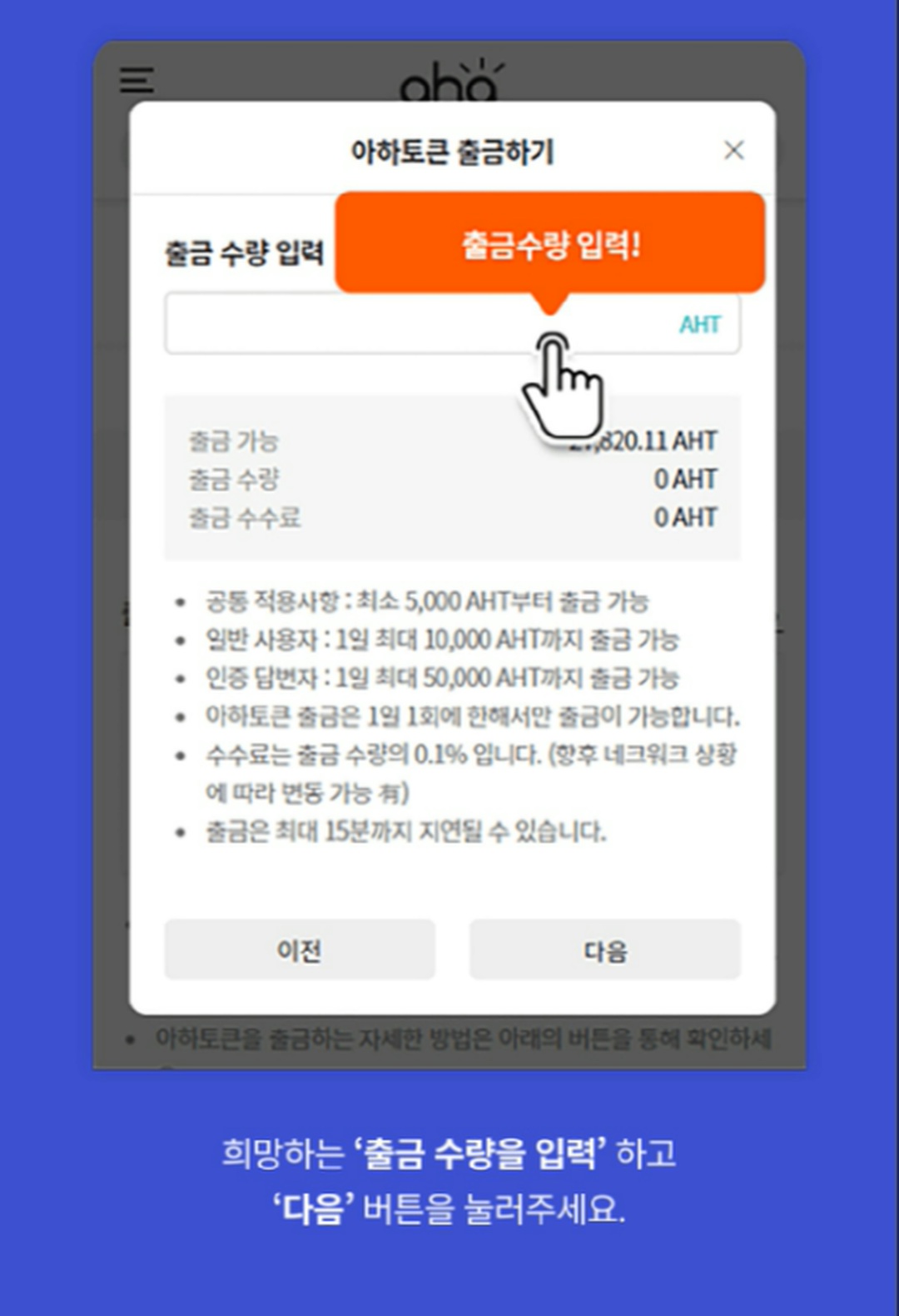 12. 출금 수량을 입력하고 다음 선택(5천 AHT부터 출금 가능)