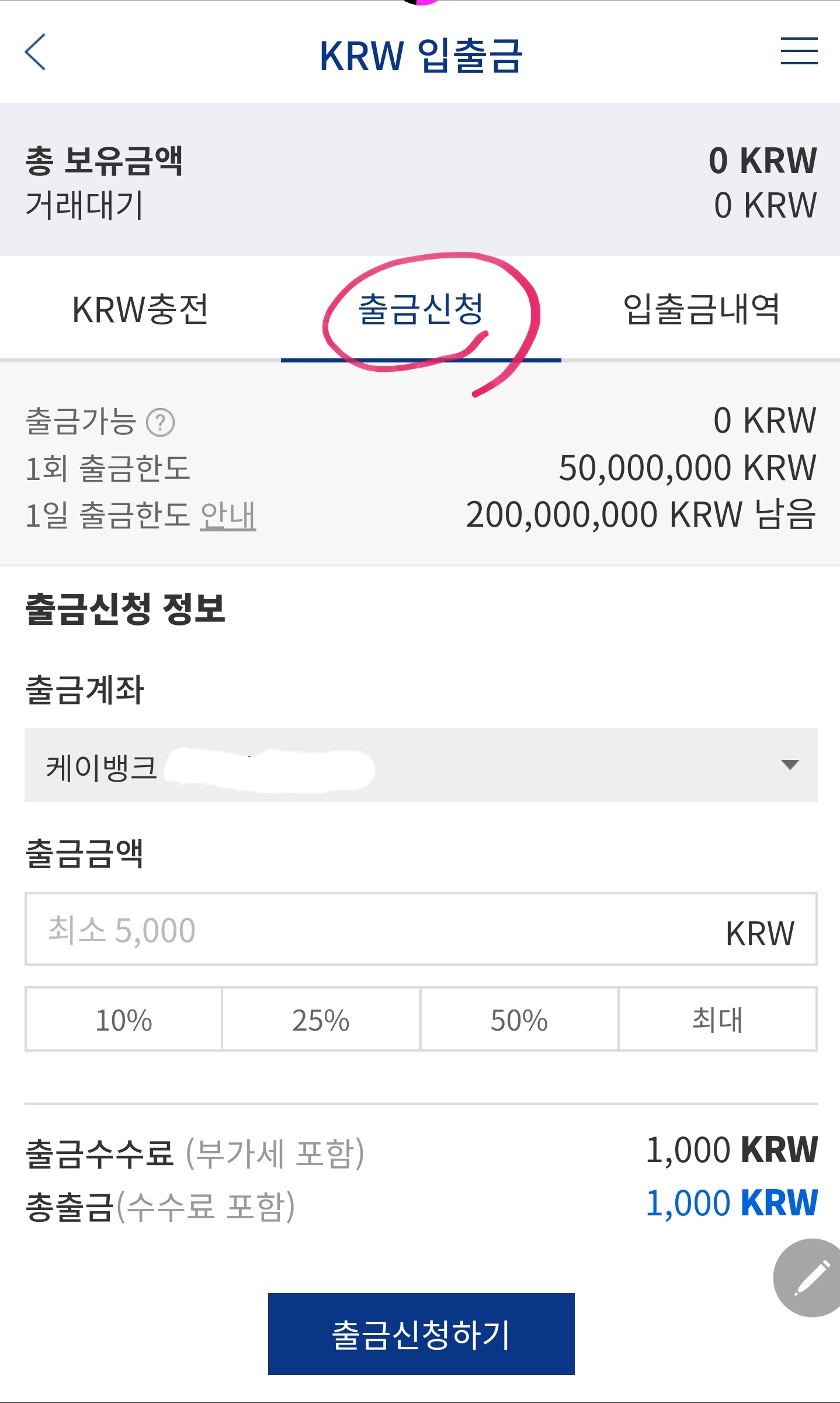5. 수수료 1000원을 제외한 나머지 금액 케이 뱅크 은행으로 출금 가능