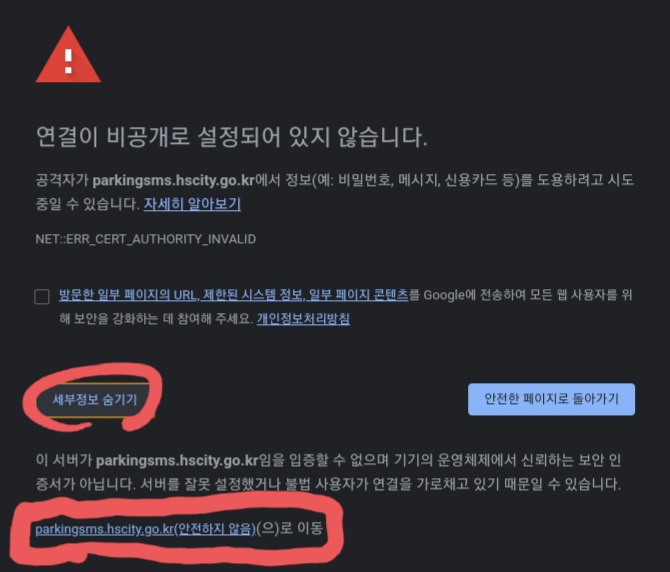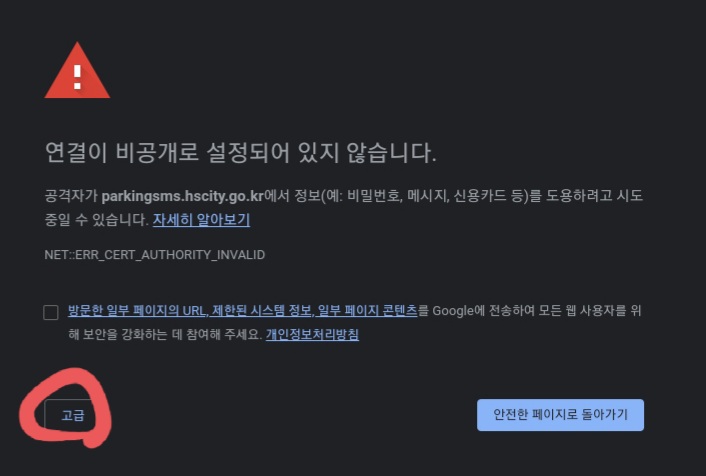 * 다음과 같은 창이 뜬다면 고급을 눌러, 안전하지 않은 페이지로 이동하기를 누르시면 진행이 가능합니다.