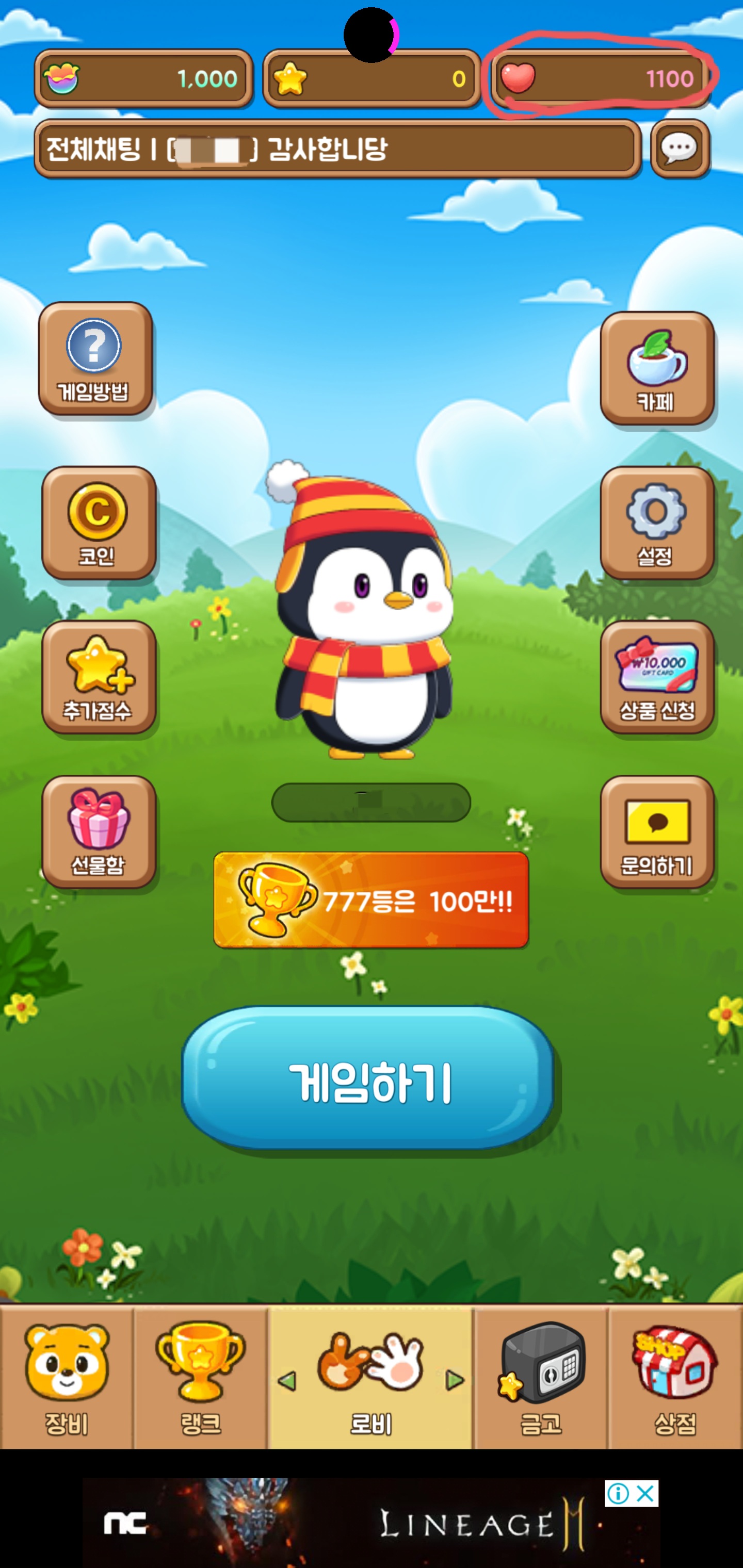 우측 상단에 보이시는 하트가 1게임당 100점이 들어갑니다.