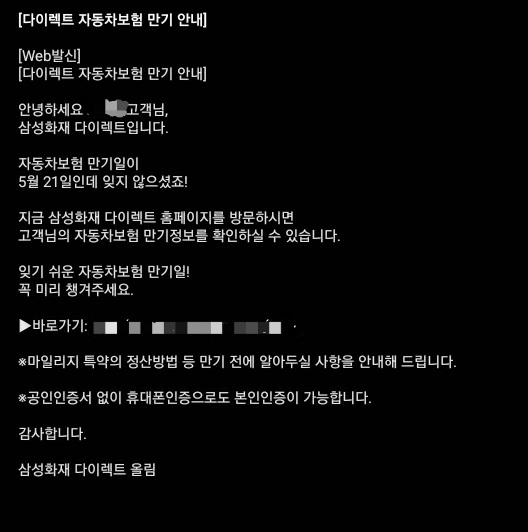 자동차보험사에서 자동차 보험의 만료일이 얼마 남지 않았을 경우에는 메일과 문자로 매일 같이 가입하라고 메일과 문자를 보냅니다.