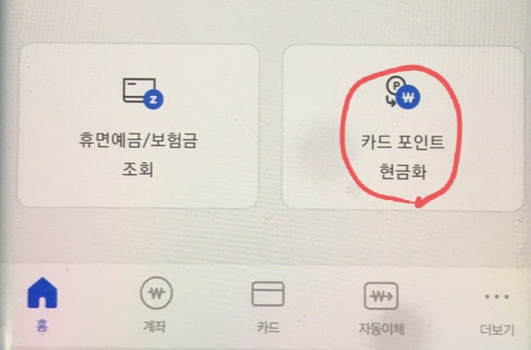 1. 앱에서 가장 하단으로 스크롤을 내려 '카드 포인트 현금화'를 선택합니다.
