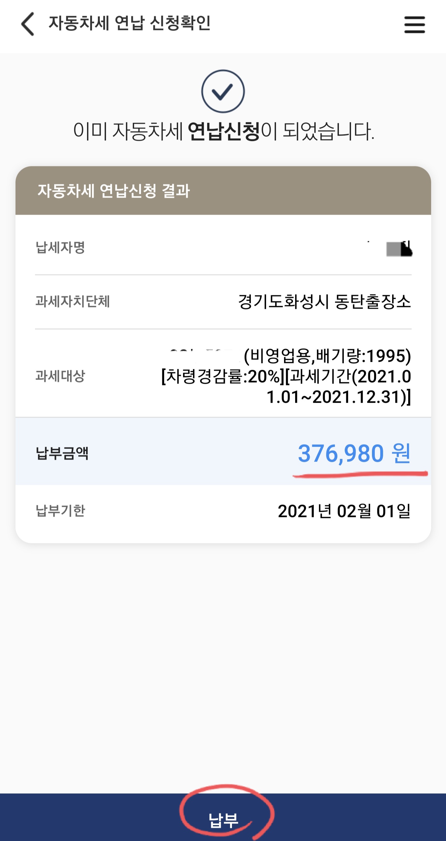 3. 연납신청 결과 창으로 이동되며 하단에 납부 버튼을 누릅니다.