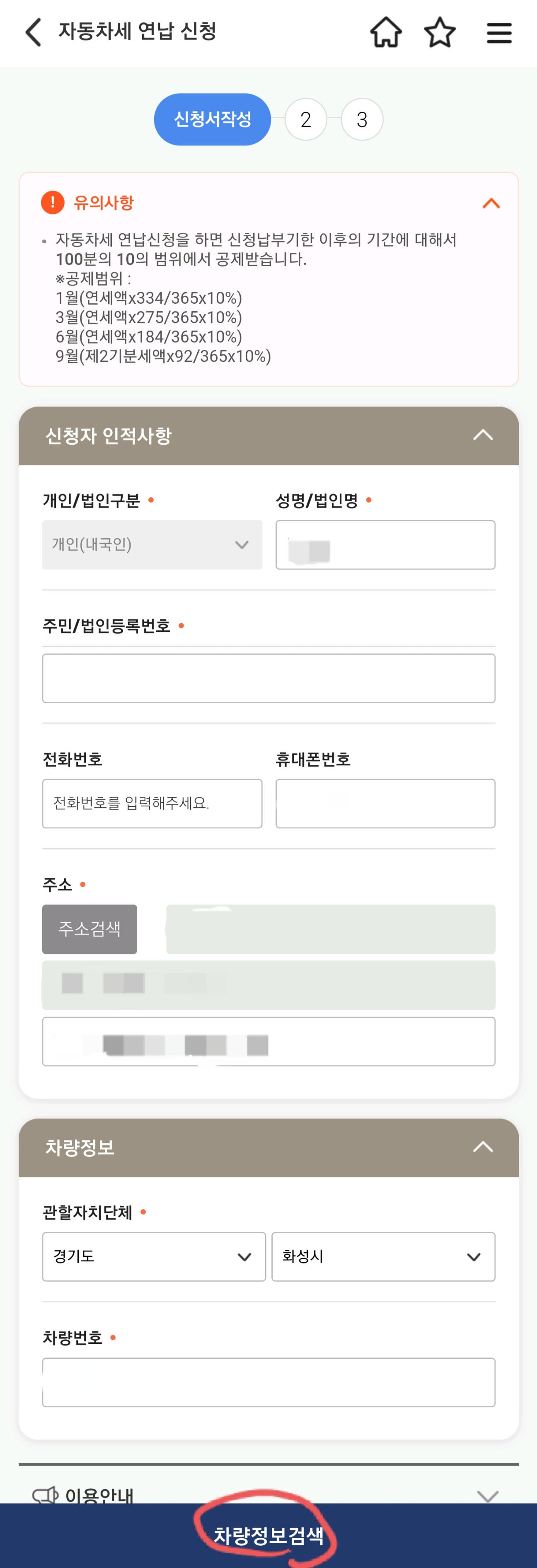 2. 신청서에 인적사항 및 차량번호를 작성하고 차량정보검색을 누릅니다.