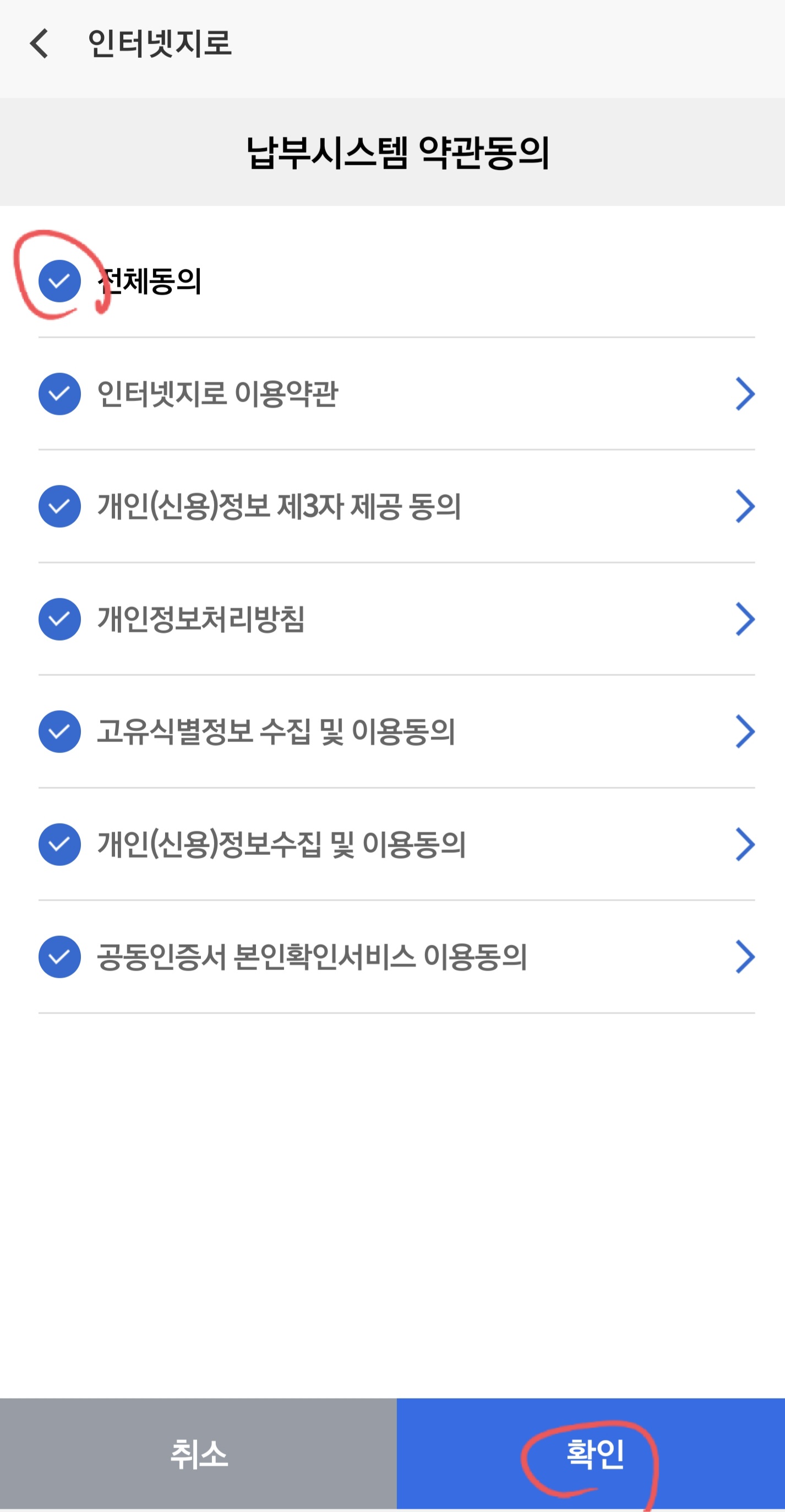 5. 납부시스템에 동의 후 확인을 누릅니다.
