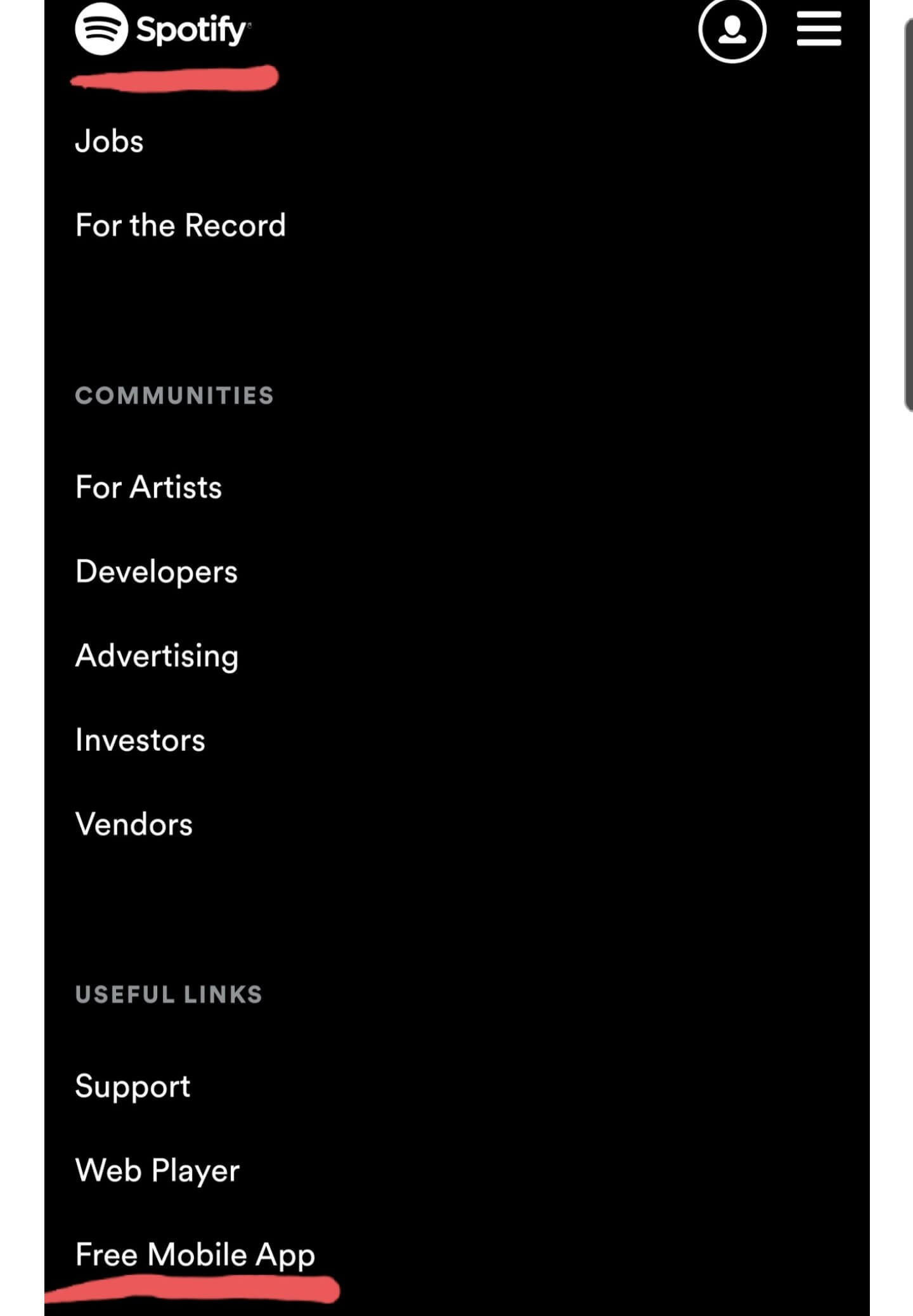 1. 앱은 좌측 상단 스포티파이 클릭 후 맨 하단으로 내리면 Free Mobile App 클릭을 하여 다운링크에 접속한다.
