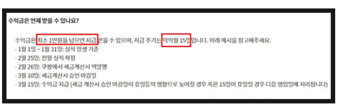 수수료 합산 금액이 10,000원 이상이 되면, 익익월에 15일에 받을 수 있습니다.