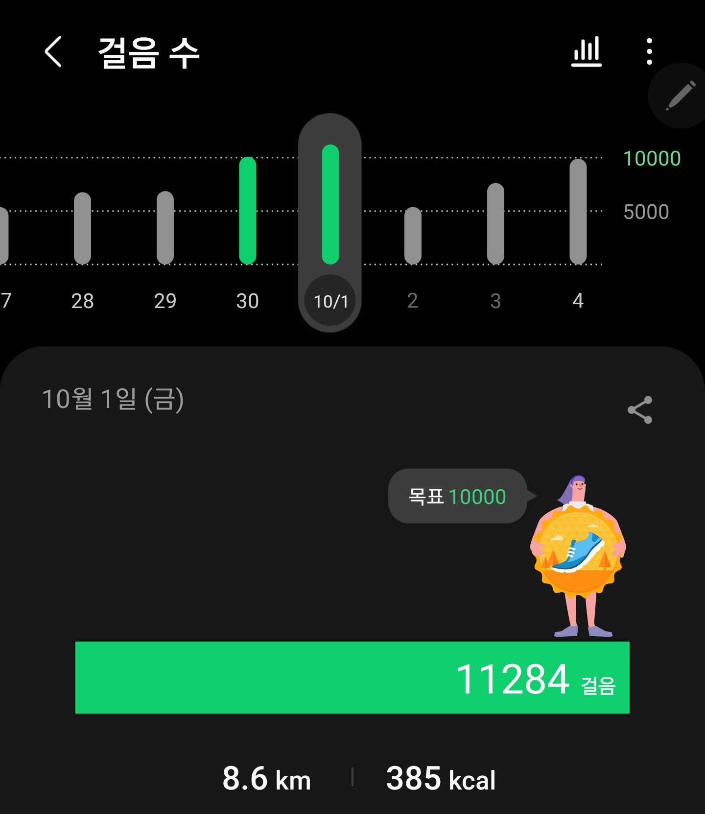 이 시에 걸었던 걸음 숫자가 1일 10,000보가 넘었어요.