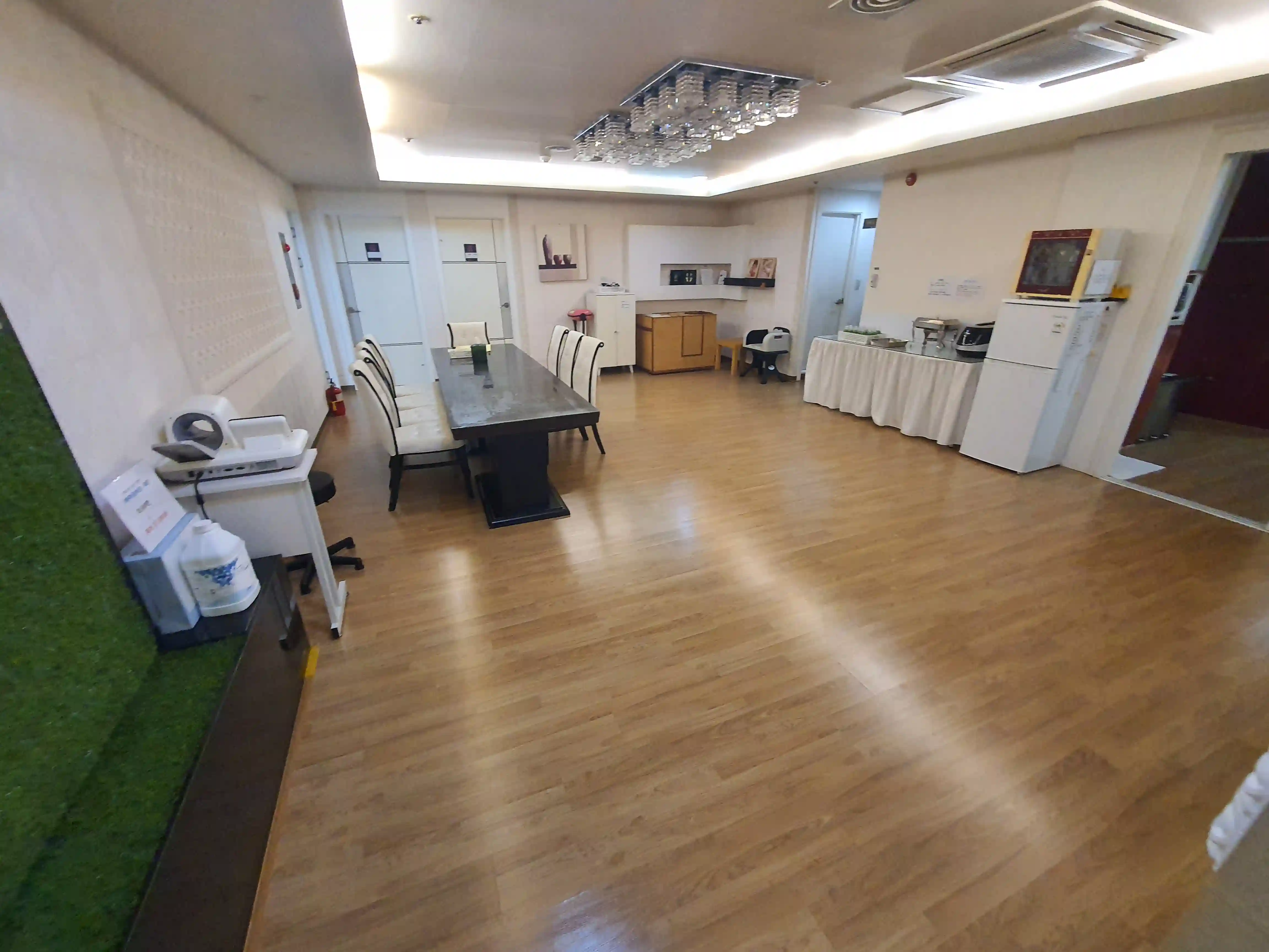 우측으로 들어오면 넓은 거실이 보이고, 혈압체크와 다인용 테이블 공용 냉장고와 젖병소독기가 비치되어 있습니다.