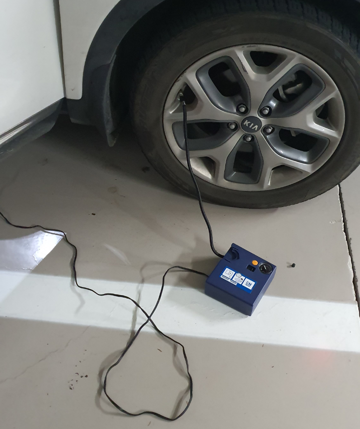 시거잭에 전원을 연결 후 타이어에 수리킷을 연결했다.