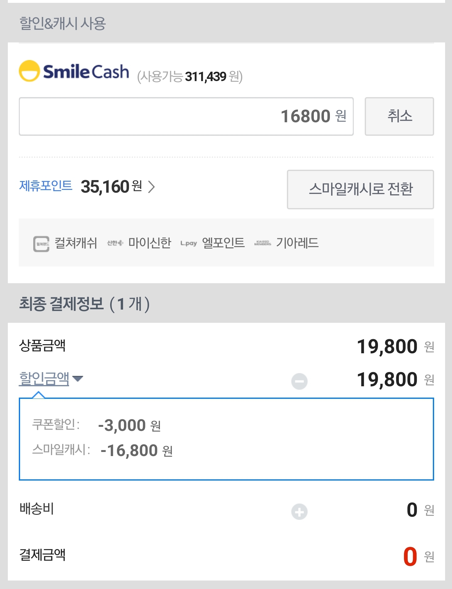 5. 결재 시 스마일 캐시로 결재하기