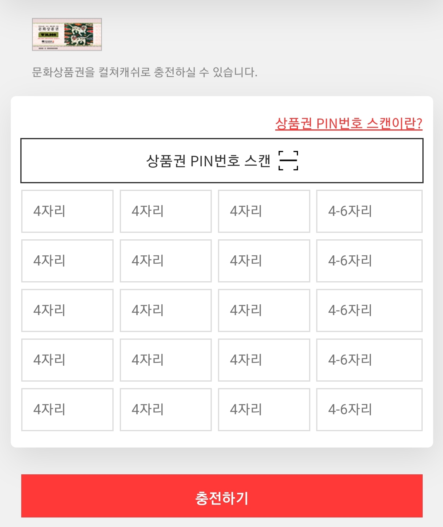 3. 상품권 PIN 번호 입력 후 충전하기 누르기