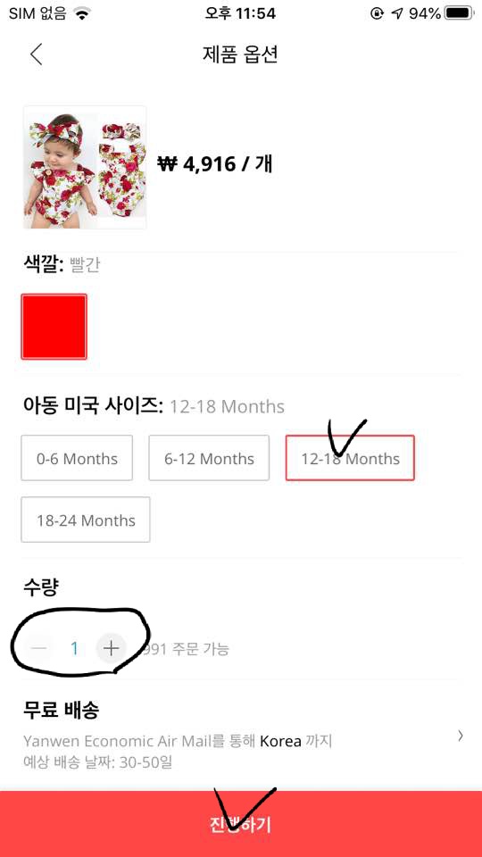 5. 원하는 수량 및 사이즈 등을 선택하고 진행하기 선택